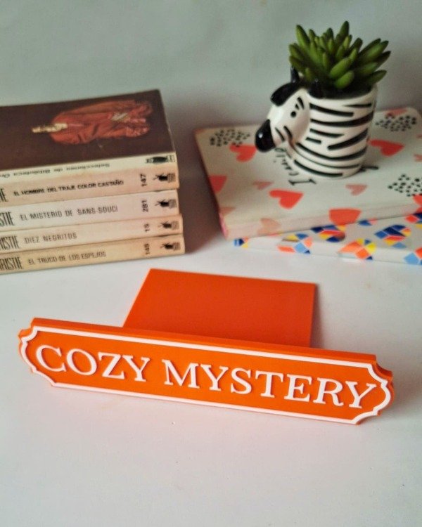 • Diseño en color naranja con la leyenda "Cozy Mystery".