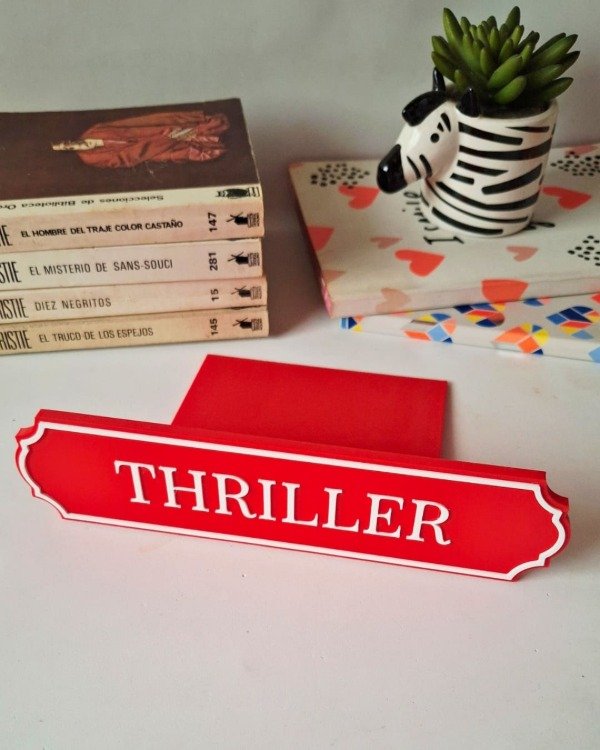 • Diseño en color rojo con la leyenda "Thriller".