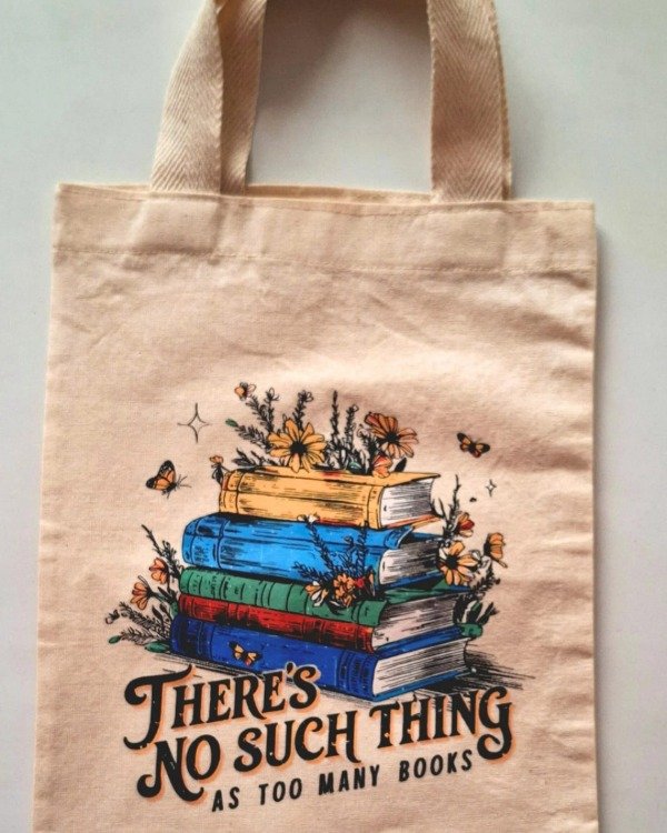 📚🌸 Mini Tote Bag 30x20 cm estampada con libros y flores y la frase “There’s no such thing as too many books”. Liviana, resistente y del tamaño ideal para tus esenciales literarios.