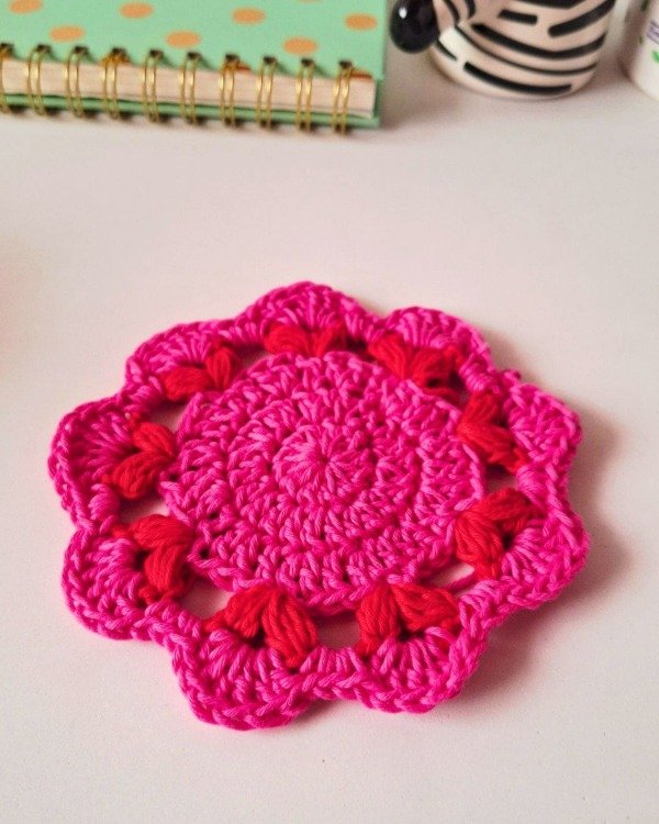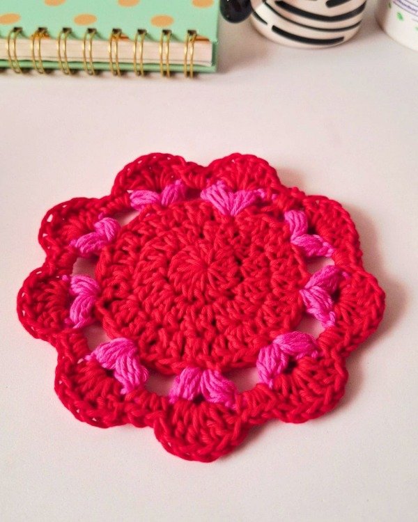 🧶 Un posatazas tejido al crochet color rosa y rojo.