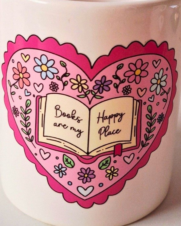 ☕️ Taza de cerámica blanca. Alto 9,7 cm; diámetro 8 cm. Estampa con corazón rosa, flores y libro con la inscripción "Books are my happy place".